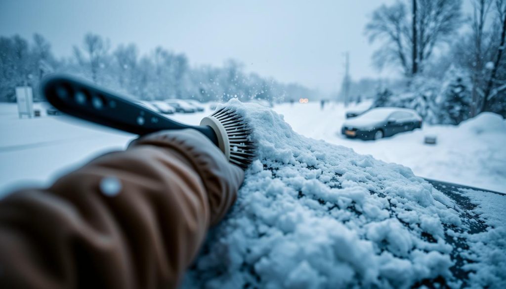 By spending a bit of time to clear your vehicle before you go, you’ll greatly improve your winter driving preparation. This simple action boosts your visibility on the road. It’s a key step for a safe and confident drive, even when dealing with lots of snow and ice removal.